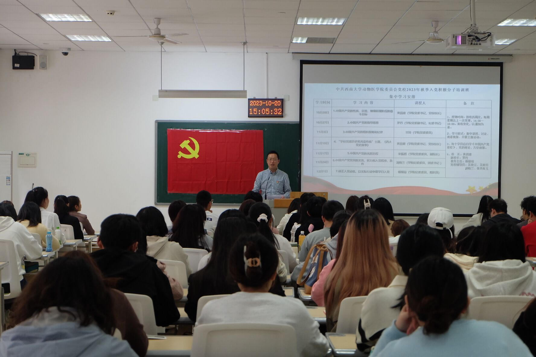 为切实加强对入党积极分子的教育培养,10月20日下午,HO5HO 党校2023年秋季入党积极分子培训班开班典礼在荣昌7B108室隆重举行,学院党委书记、党校校长黄昌建,学院纪委委员、团委书记刘晓兰,学院纪委委员、组织员杨银琼,党校辅导员吴婷芳、吴秋云、张秀虹玉及99名入党积极分子参加本次开班典礼。