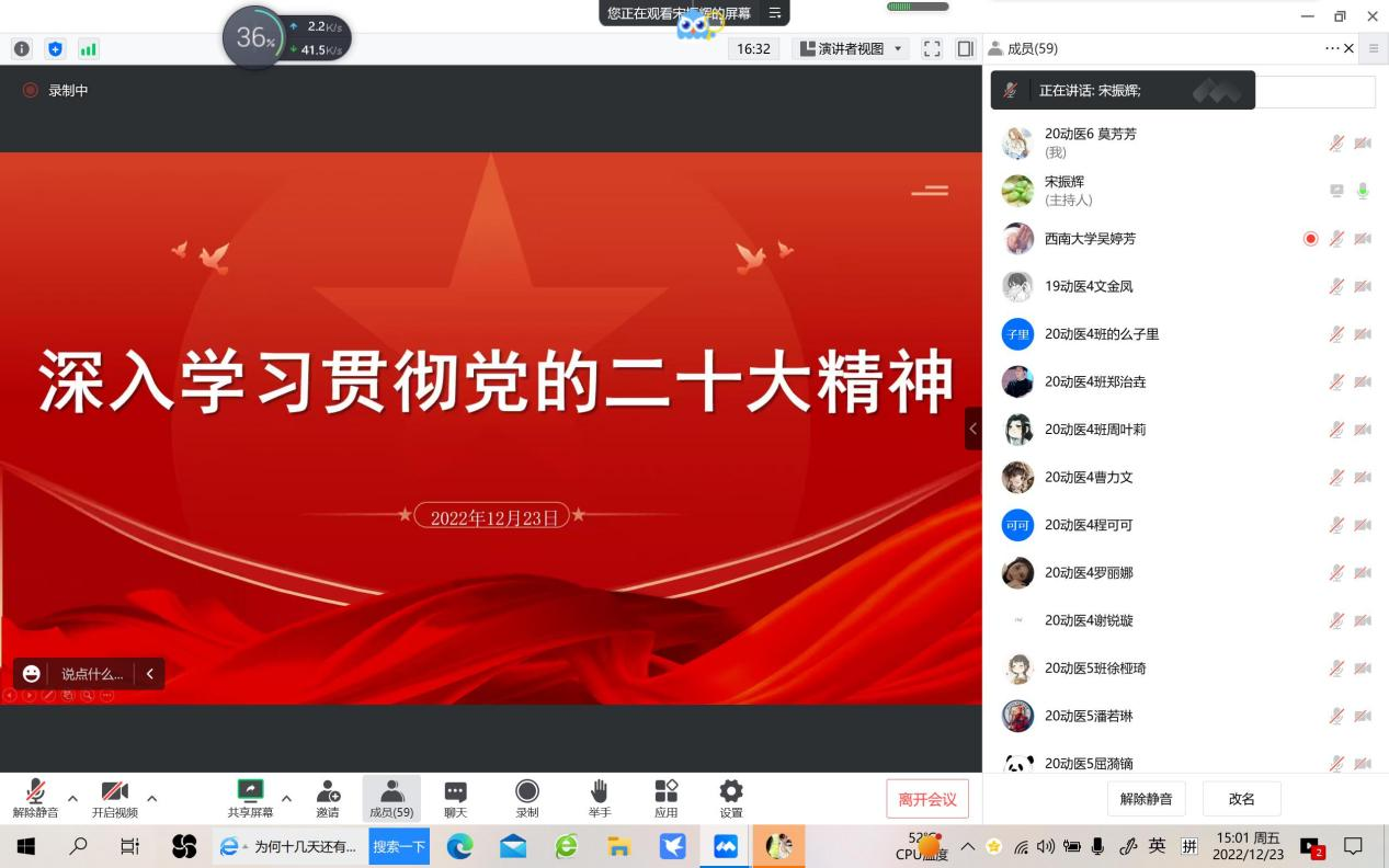 为深入学习贯彻党的二十大精神,12月23日下午,学院党委委员宋振辉同志深入本科生二支部线上宣讲了党的二十大精神。带领本科生二支部全体从中国共产党发展史的角度、中华民族发展史的角度、世界文明发展史的角度深刻认识了党的二十大召开的重大意义;从九个方面全面准确学习领会党的二十大精神。