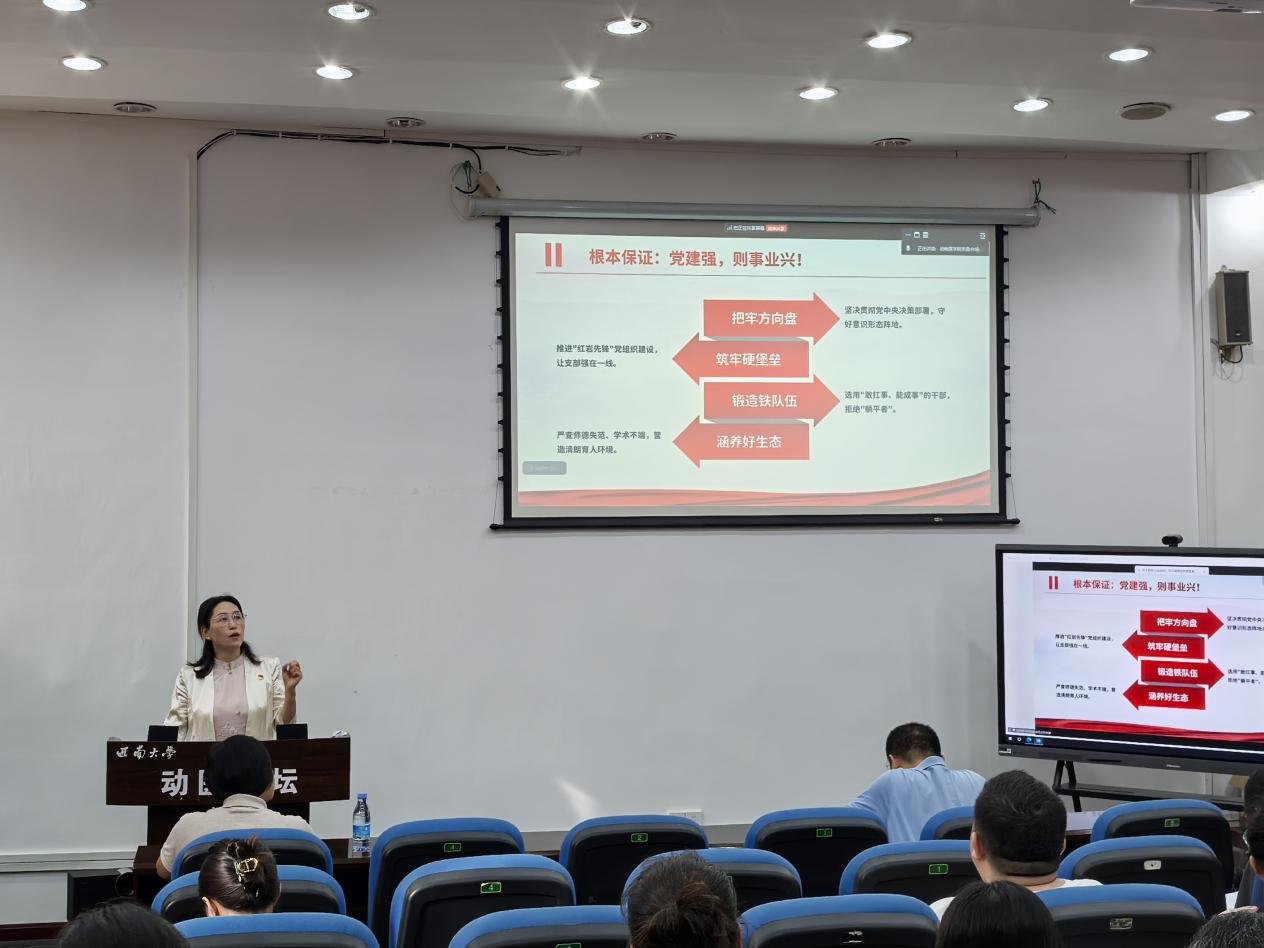 李海燕书记强调,学校党代会精神是指导学院未来发展的纲领性文件。她要求全体教职工深刻领会精神实质,紧密结合学院实际,将大会要求转化为具体行动。她号召大家以"矢志一流"的雄心锚定目标,用"改革创新"的锐气破解难题,凭"以质图强"的实干再创辉煌,为建成特色鲜明的世界一流大学和教育强国建设贡献动医人的智慧和力量。
