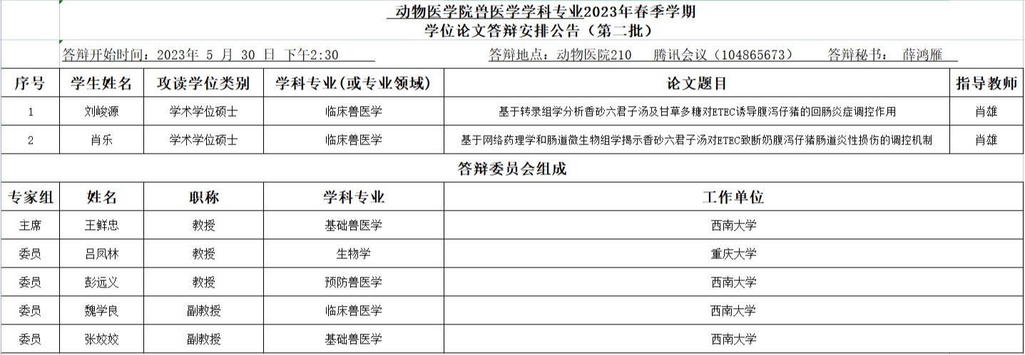 HO5HO 兽医学学科专业2023年春季学期学位论文答辩安排公告(第二批)