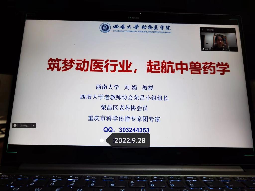 中兽医药退休专家刘娟教授、朱兆荣副教授分别为2022级全体动物医学类专业学生做了题为“逐梦动医行业,启航中兽药学”和“从社会变迁看针灸发展方向”的专题报告,报告采用线上与线下结合的方式进行。报告由中兽医学系主任曹立亭副教授主持,学院中兽医学系全体老师、在荣研究生及部分动物医学专业本科生参加了会议。