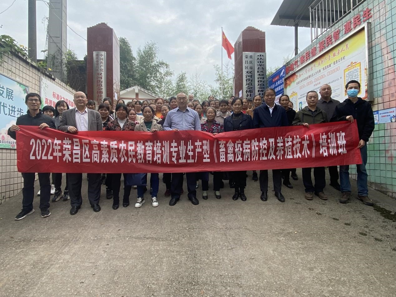 承办的荣昌区高素质农民专业生产培训班(第三期)于2022年10月16日在双河街道金佛社区圆满结业。荣昌区农委动物疫病预防控制中心范才良、宣传信息科陈文远、双河街道兽医站站长陈勇、HO5HO