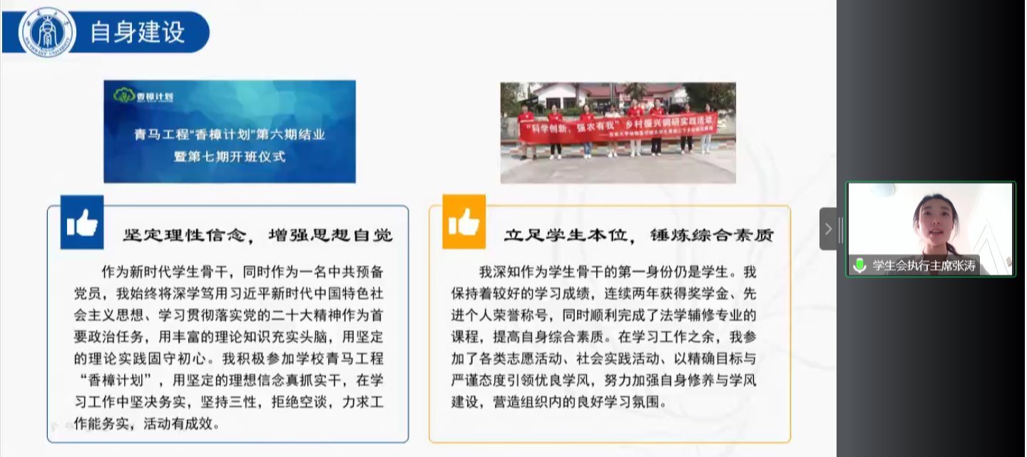 会议中,团委学生会主席团成员以学习宣传贯彻党的二十大精神为出发点,从自身政治态度、作风纪律、学习情况、工作业绩等方面进行述职。他们提出要坚持“全心全意服务同学”的宗旨,全面反思总结工作经验、不断推进自身改革,认真履行工作职能。