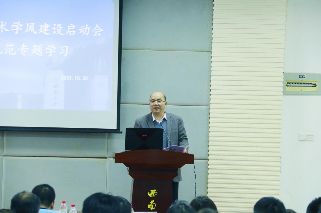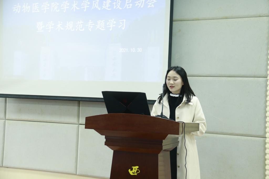 为推进研究生学术学风建设及研究生导师师德师风建设,根据研工部《关于开展2021年研究生学术学风建设系列活动的通知》要求,学院于2021年10月30日下午3点在北碚校区动物医院报告厅(线下)、荣昌校区3110报告厅(线上)顺利举行研究生学术学风建设活动启动会暨学术规范专题学习。学院党政领导、研究生导师及全体研究生参加会议。会议特邀第三军医大学庄园博士作关于《科学道德和学风建设》报告。会议由党委副书记、纪委书记黄庆洲主持。