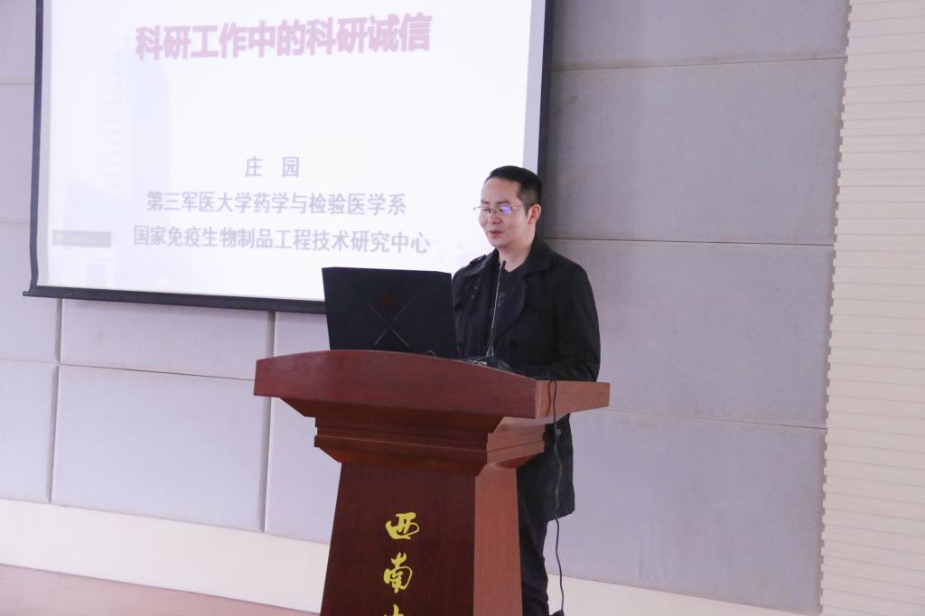 大会第二项议程由第三军医大学庄园教授为同学们作科学道德和学风建设专题报告。庄园老师以“科研工作中的科研诚信”为题,结合自身经历,向全体研究生介绍了在开展研究、论文撰写、开展学位论文工作时所应遵守的学术规范。报告强调,同学们要强化底线意识、养成良好学风,在通向科学的路程中勇于探索、不断创新。