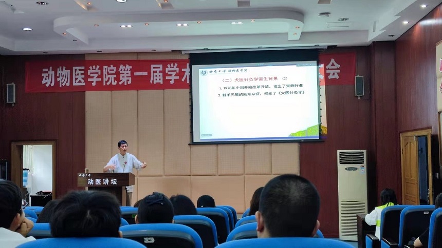 朱兆荣副教授首先介绍了犬医针灸学的内涵、犬医针灸学诞生的背景、著作《犬医针灸学》的初心、《犬医针灸学》的内容以及犬病防治;接着将其丰富的中兽医知识储备与临床实践经验相结合,与同学们分享了他多年从事兽医针灸事业的经历与心得;最后,朱老师为同学们浅析了兽医针灸学国内外发展现状以及未来的发展方向,并希望后辈们能够接续前行,将中(兽)医国粹发扬光大。