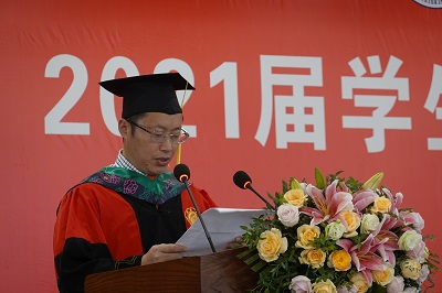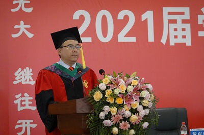 学院院长刘娟代表学院对全体2021届毕业生致以最诚挚的祝贺和最美好的祝愿,并以《守初心 敢追梦 奋斗新时代》为主题,带领大家回顾了学院的历史、历年的发展和取得的成就,在同学们即将踏上新的征程之时,提出了三点希望:第一,志存高远、脚踏实地;第二,静水流深、有容乃大;第三,创新创业、追求卓越。