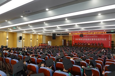关于2021年博士硕士学士授予的决定》。学院院长刘娟,党委书记黄昌建,党委副书记、纪委书记黄庆洲,副院长方仁东,学院教授马跃、甘玲、李继祥、吴俊伟、周荣琼,学院各系主任上台为毕业生授位,并颁发证书。