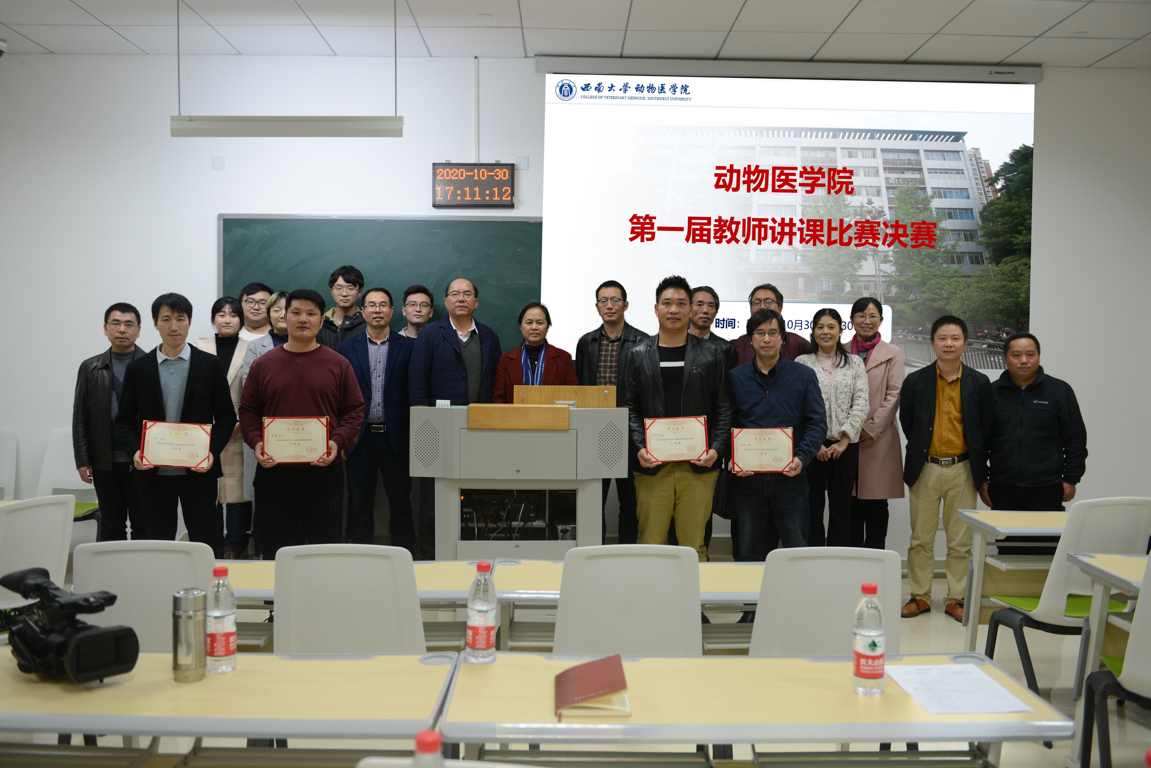 分别在主会场(荣昌7B108)和分会场(北碚动物医院210会议室)举行第一届教师课堂教学比赛决赛。全院教职工和部分学生代表出席会场。此次评委由学院黄昌建书记、刘娟院长、王鲜忠教授、马跃教授、李继祥教授、周荣琼教授、王自力教授、李能章副教授、黄兰香副教授等9位老师和5位学生代表组成。