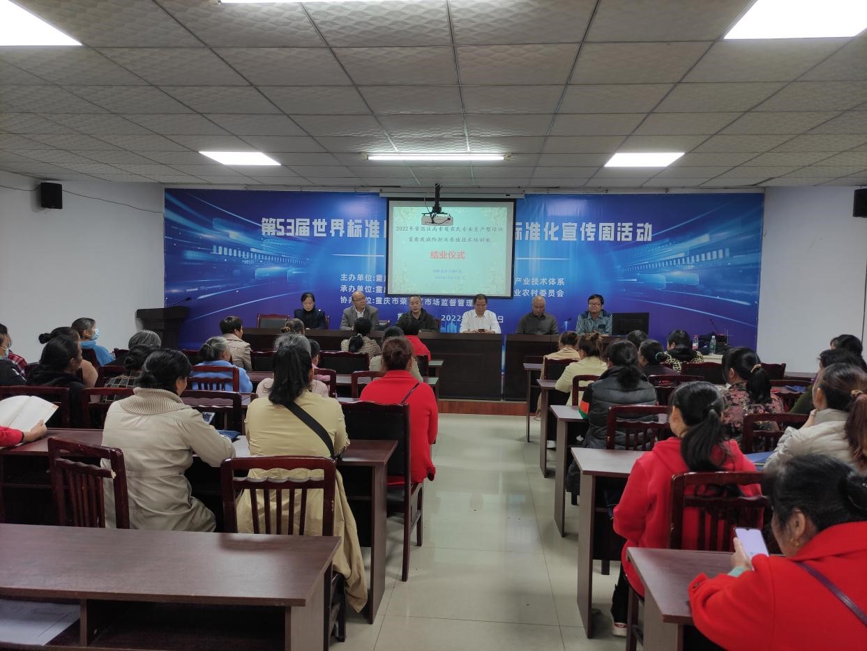 承办的荣昌区高素质农民专业生产培训班(第三期)于2022年10月16日在双河街道金佛社区圆满结业。荣昌区农委动物疫病预防控制中心范才良、宣传信息科陈文远、双河街道兽医站站长陈勇、HO5HO