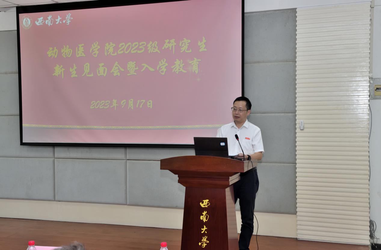 9月17日上午9点30分在动物医院报告厅举行2023级研究生新生见面会暨入学教育,学院党委书记黄昌建、院长方仁东、副院长宋振辉、研究生导师代表、研究生教学秘书、辅导员、班主任等出席本次见面会。会议由学院党委副书记,纪委书记罗丹主持,会议在全体人员奏唱《中华人民共和国国歌》中拉开帷幕。