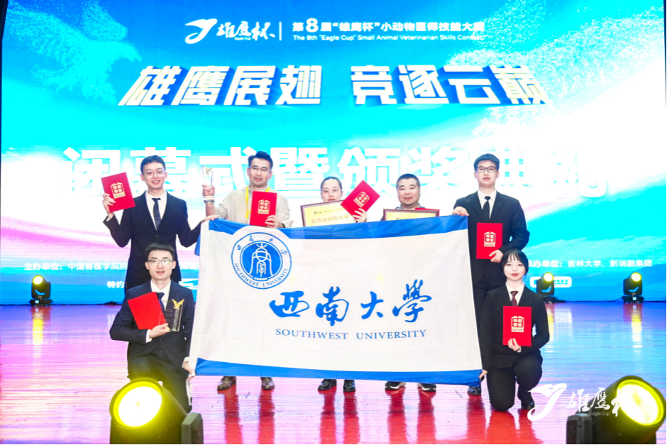 最终,我校学子不负众望,再创辉煌,从全国117所农业高校中脱颖而出,最终以总分第一名的骄人成绩勇夺得第八届“雄鹰杯”小动物医师技能大赛大学生组“团体特等奖”。这也是我校连续第五次蝉联该项赛事特等奖。其中,胥辉豪、张德志、江莎老师获得“优秀辅导教师特等奖”,胥辉豪老师作为优秀辅导老师代表在大赛闭幕式上进行发言;程钏同学获得“兽医新星奖”;我校获得“最佳组织院校奖”。我校在刷新成绩纪录的同时,再次彰显了HO5HO