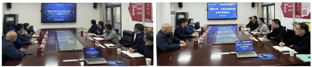 报告结束后,王琴研究员以及亿森宝王新杰总经理应邀参加了学院校企交流座谈会。学院党委书记黄昌建、院长方仁东、党委副书记、纪委书记罗丹、副院长宋振辉参加了此次座谈会。会上,黄昌建书记首先表达了对校友回母校以及对贵公司的到访表示出热烈欢迎,并对学院近几年在师资队伍、学科建设、专业发展以及人才培养、社会服务等方面进行了介绍,以期和贵公司建立合作关系,为人才培养奠定基础。同时,王琴研究员从公司成果、研究方向、市场营运等方面对公司的发展情况进行了介绍,并表示期望与学院建立深入合作关系。