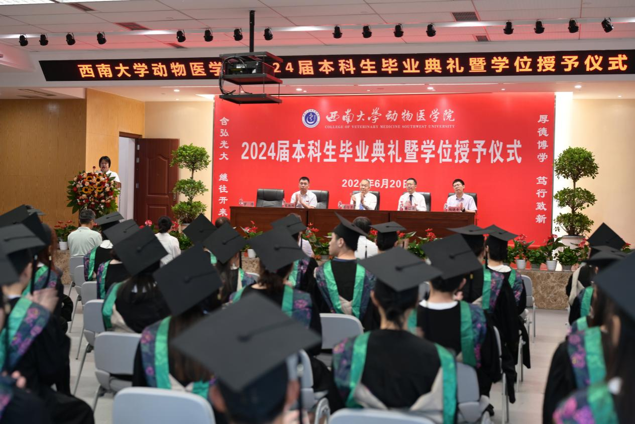 2024届本科生毕业典礼暨学位授予仪式在荣昌校区7B101报告厅隆重举行。学校副校长葛信勇、学院党政领导、教师代表、毕业生辅导员、班主任、2024届毕业生、毕业生家长共同参加。毕业典礼由学院党委副书记,纪委书记罗丹主持,学位授予仪式由学院副院长宋振辉主持。