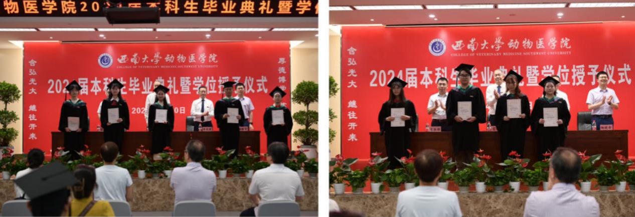 关于表彰2024年优秀毕业生的决定》,主席台就坐的领导为优秀毕业生代表颁发荣誉证书。