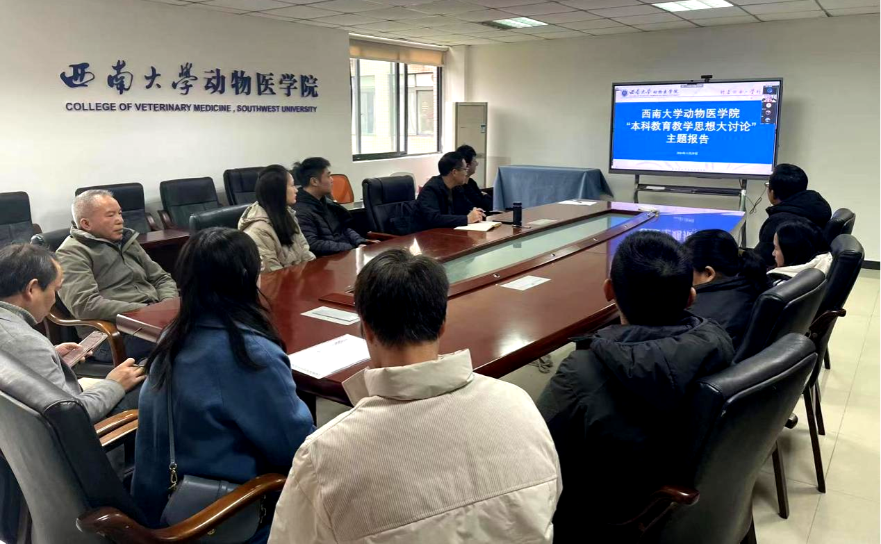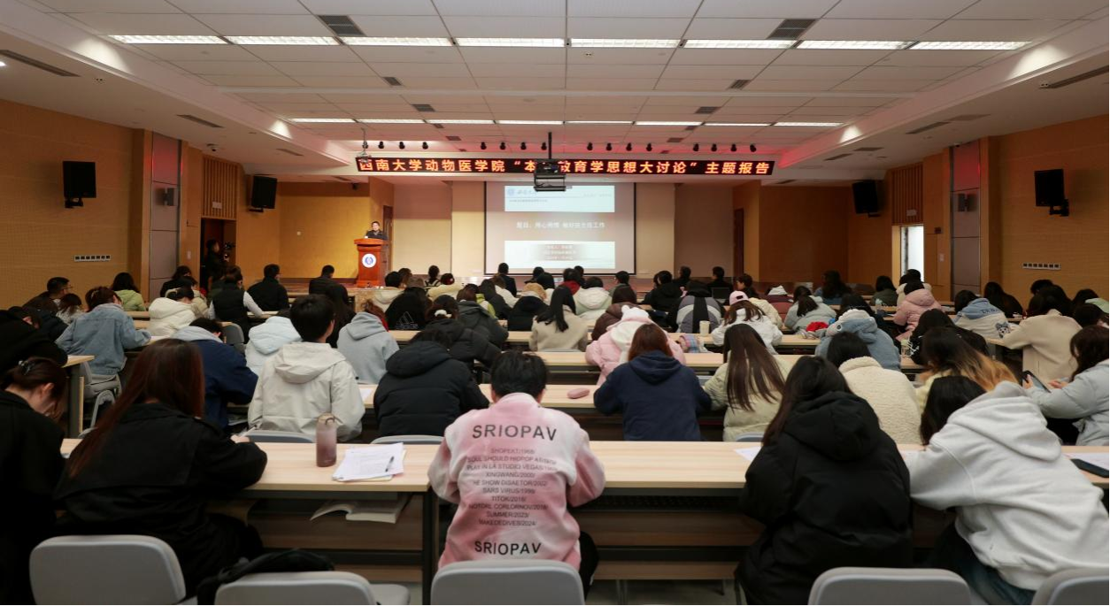 为全面贯彻落实党的二十大、二十届三中全会、全国教育大会精神,进一步解放思想、更新理念、凝聚共识,共同谋划学院本科教育事业高质量发展,落实《以本为本、以生为本,全面推进卓越人才培养本科教育教学思想大讨论工作方案》,学院组织开展了系列以党建引领,深化党建与事业融合发展,推动本科教育教学思想大讨论的人才培养工作。2024年11月29日,学院在荣昌校区7B101报告厅、北碚校区动物医院210会议室举办本科教育教学思想大讨论主题报告会,学院党政领导、全院教职工、企业专家代表及学生代表等参加了主题报告会,本次报告会邀请了校企合作恒泰集团首席战略官兼重庆&北京分公司总经理冯喆、瑞派宠物医院校企合作与招聘助理总监洪海蛟等企业代表参会。会议由学院副院长陶晓奇主持。