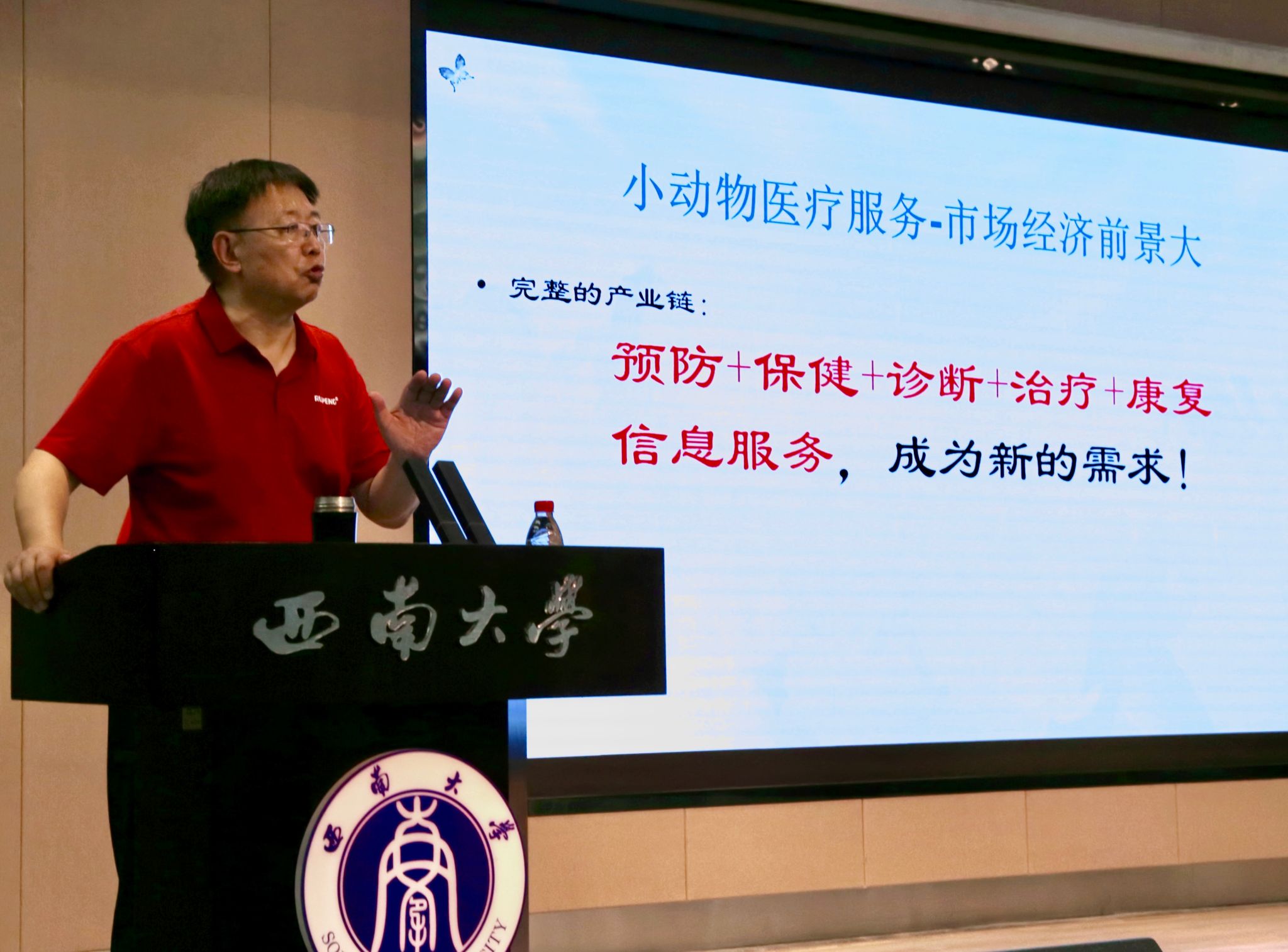 教授、新瑞鹏宠物医疗集团专家委员会主任林德贵担任主讲嘉宾,带来了题为“兽医专业选择、发展与AI时代机遇”的精彩讲座,由学院副院长宋振辉教授主持。