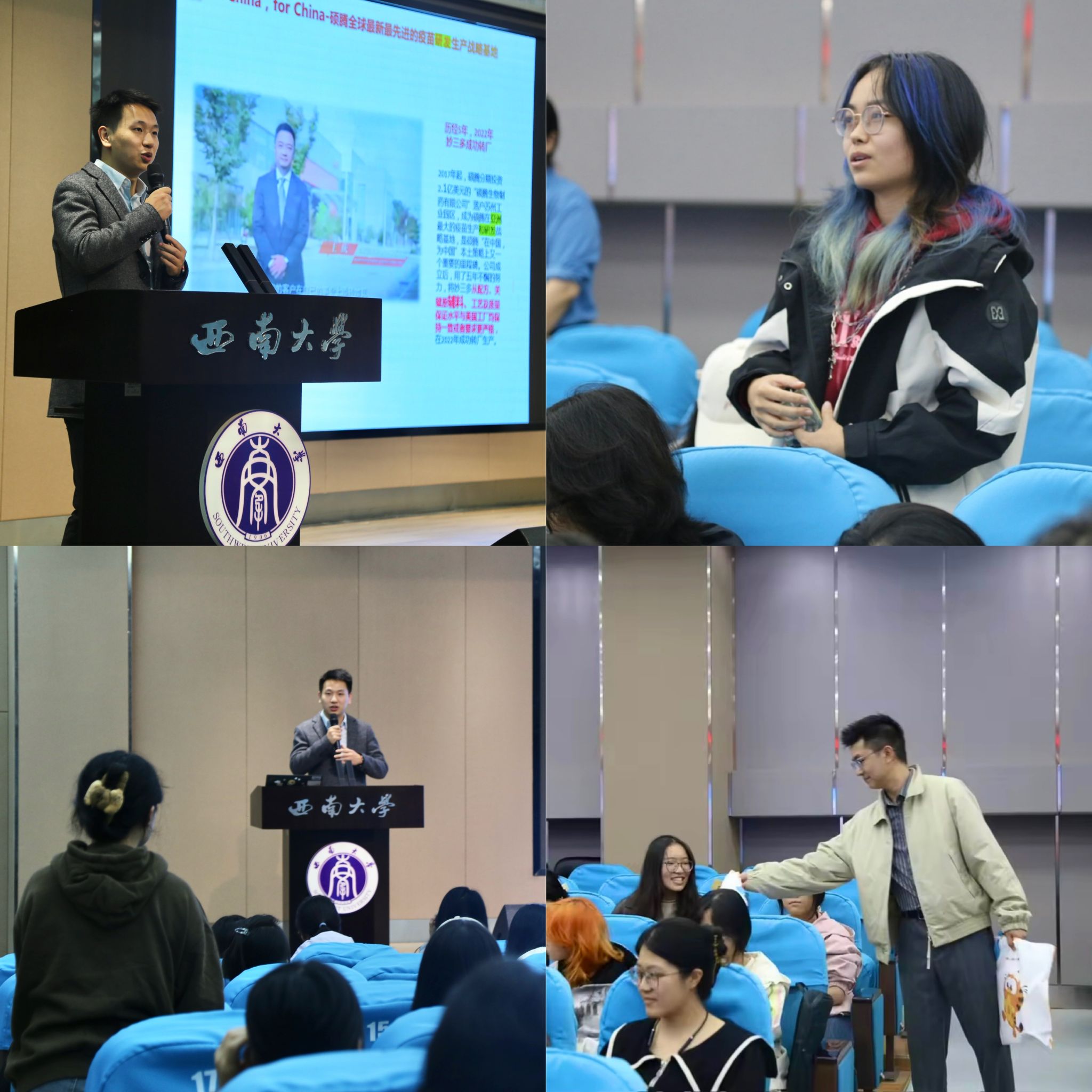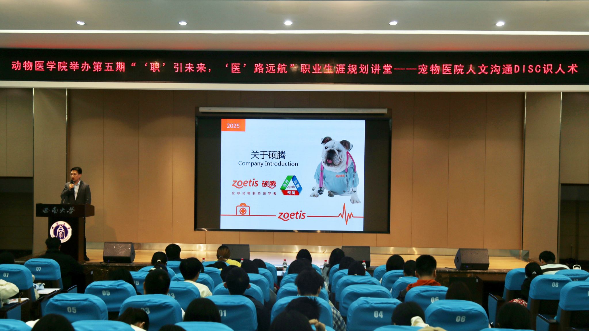 在荣昌校区2211报告厅成功举办第五期“‘职’引未来,‘医’路远航”职业生涯规划讲堂。本期活动特邀硕腾(上海)企业管理有限公司西南二区经理杜港,带来题为“宠物医院人文沟通与DiSC识人术”的专题分享,吸引学院各年级两百余名学生积极参与。