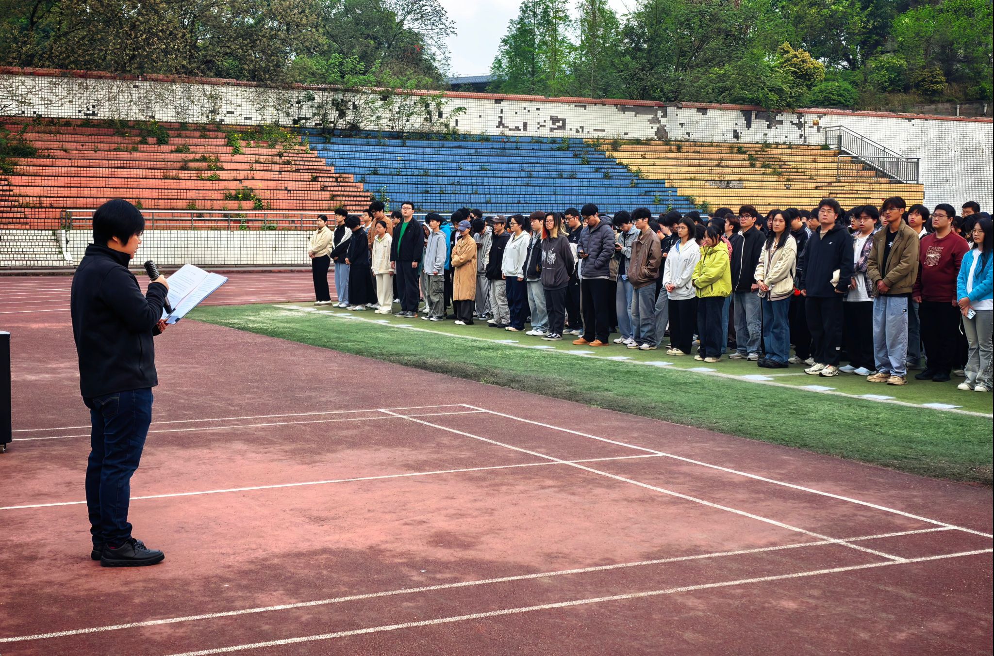 在荣昌校区操场举行升旗仪式。学院党委副书记罗丹围绕“传承百廿荣光,守护生命健康”作国旗下讲话,学院团委书记主持仪式,全体在荣本科生参加活动。