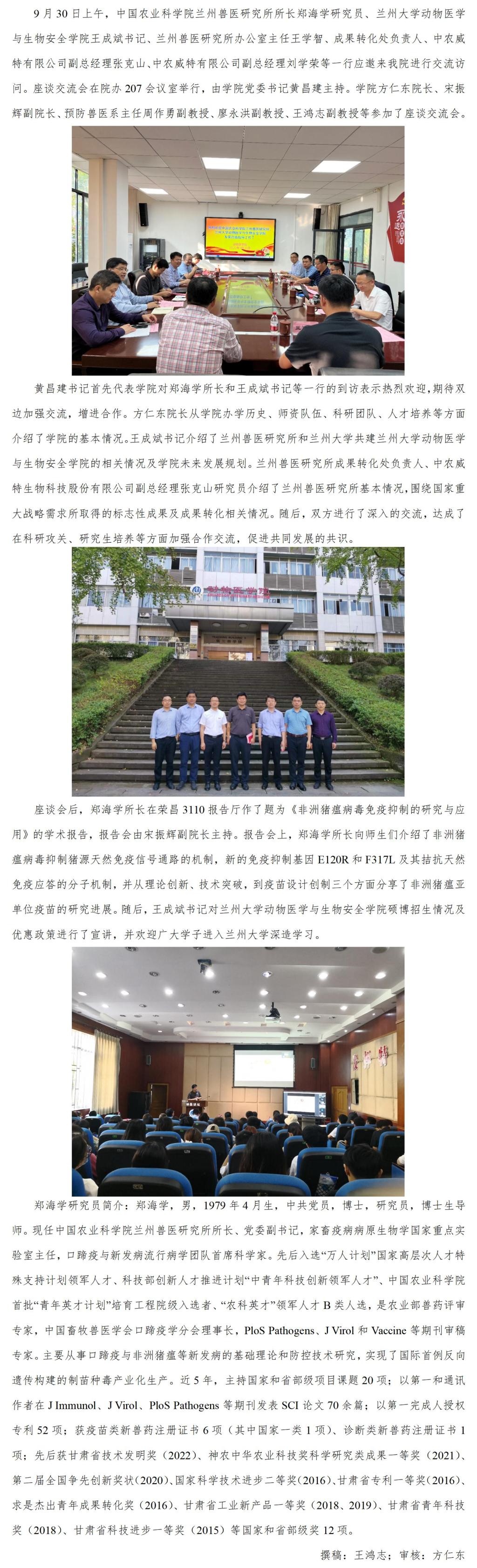 中国农业科学院兰州兽医研究所郑海学所长一行来HO5HO 交流并作学术报告