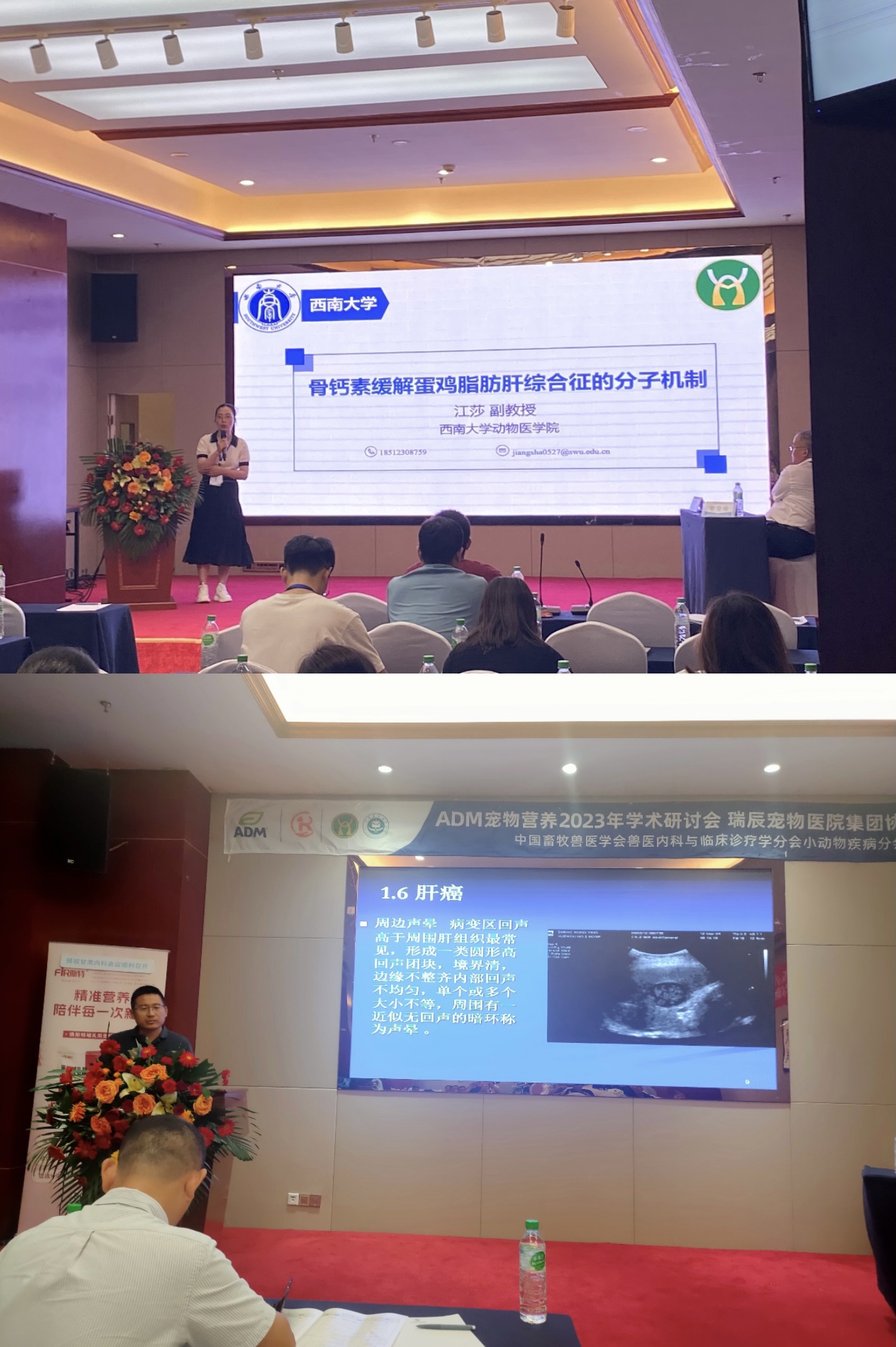 本次会议以“提高教学科研诊疗水平,保障动物养殖健康发展”为主题,围绕兽医内科与临床诊断最新教学科研成果和临床实践进行了7个大会主题报告和45个分会场报告。江莎和王庆华分别以“骨钙素缓解蛋鸡脂肪肝综合征的分子机制”和“B超在兽医临床诊疗的应用”为题进行汇报,郜航进行壁报展示。学院李前勇、易华山和王庆华当选为内科与临床诊疗学分会理事。