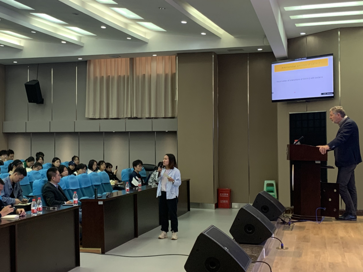 Henk教授展开主题为“利用先天免疫系统的调节与重编程替代抗生素疗法的研究”的报告,该报告重点介绍了CATH-2衍生肽抗菌机制、免疫调节活性机制及通过重编程细胞代谢增强细胞的免疫反应的研究,该研究为抗菌肽作为抗菌药物和作为疫苗佐剂的研发提供了参考。该报告全程由彭连慈副教授翻译,现场师生认真倾听并不时报以热烈的掌声。