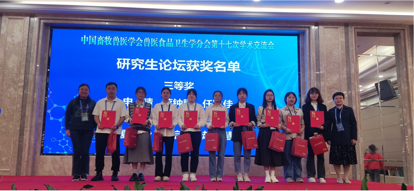 大会秉承“绿色生产,肉品安全,维护健康”的理念,围绕动物源性产品安全生产领域的热点科研问题开展学术交流。来自国内三十余所农学类高校及科研院所参加了此次学术交流会,大会特邀业内四十余位专家进行了学术报告。方仁东教授做了题为“牛多杀性巴氏杆菌感染与宿主天然免疫应答”的学术报告。本次大会还特别增设了研究生论坛,为优秀研究生提供展示自己的平台。学院博士研究生芦懿以“鸡源抗菌肽CATH-1对猪链球菌2型的体内外抗菌及抗炎活性研究”为题进行了学术汇报,并荣获“研究生论坛三等奖”;硕士研究生于惊蛰以“生鲜猪肉中有机磷酸三酯的污染水平及膳食暴露风险评估”为题进行了汇报。两位研究生的学术报告充分展示我了HO5HO