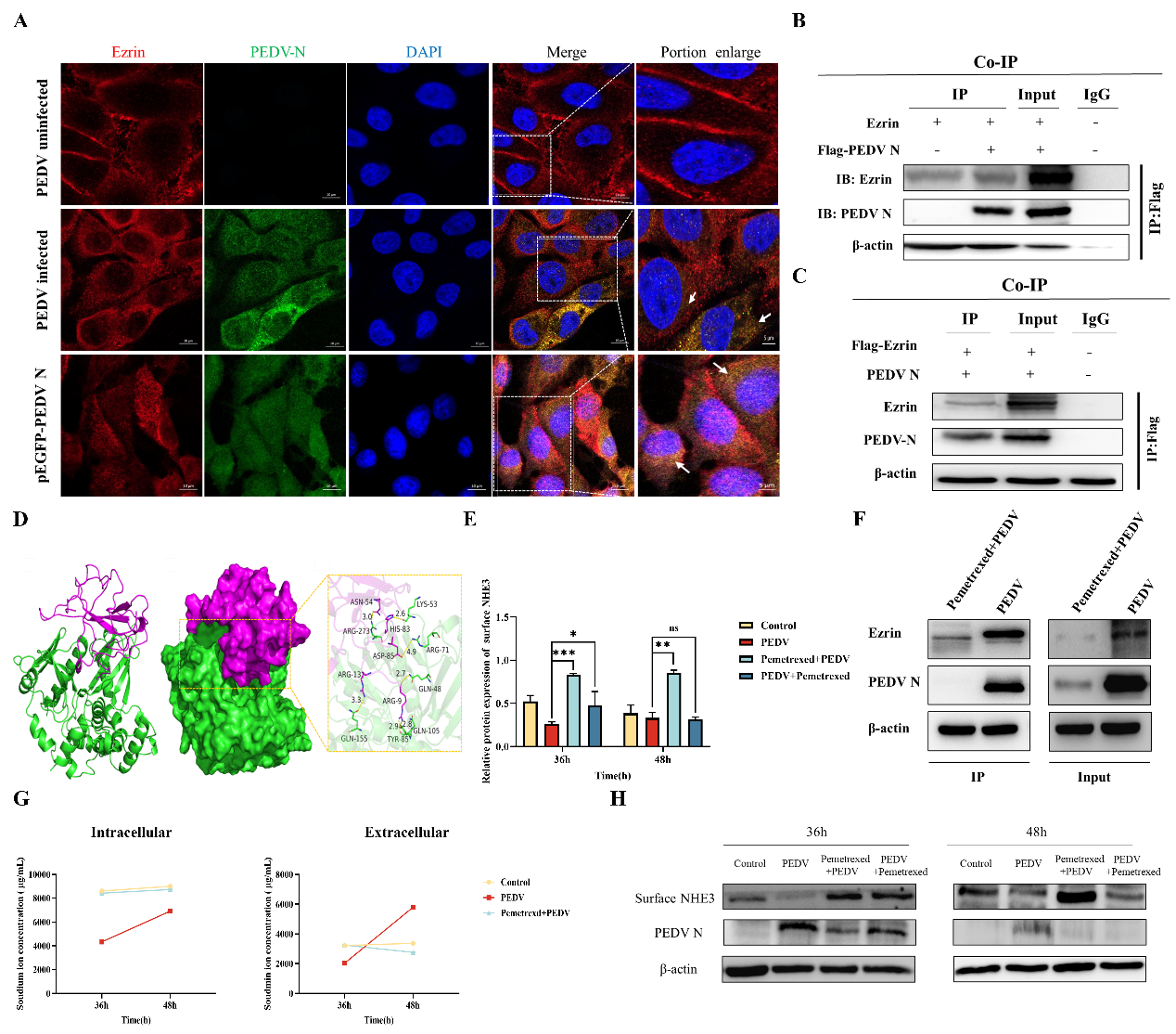 图 PEDV N与Ezrin互作及培美曲塞对PEDV感染条件下表面NHE3蛋白水平、PEDV滴度、胞内外Na+浓度的影响