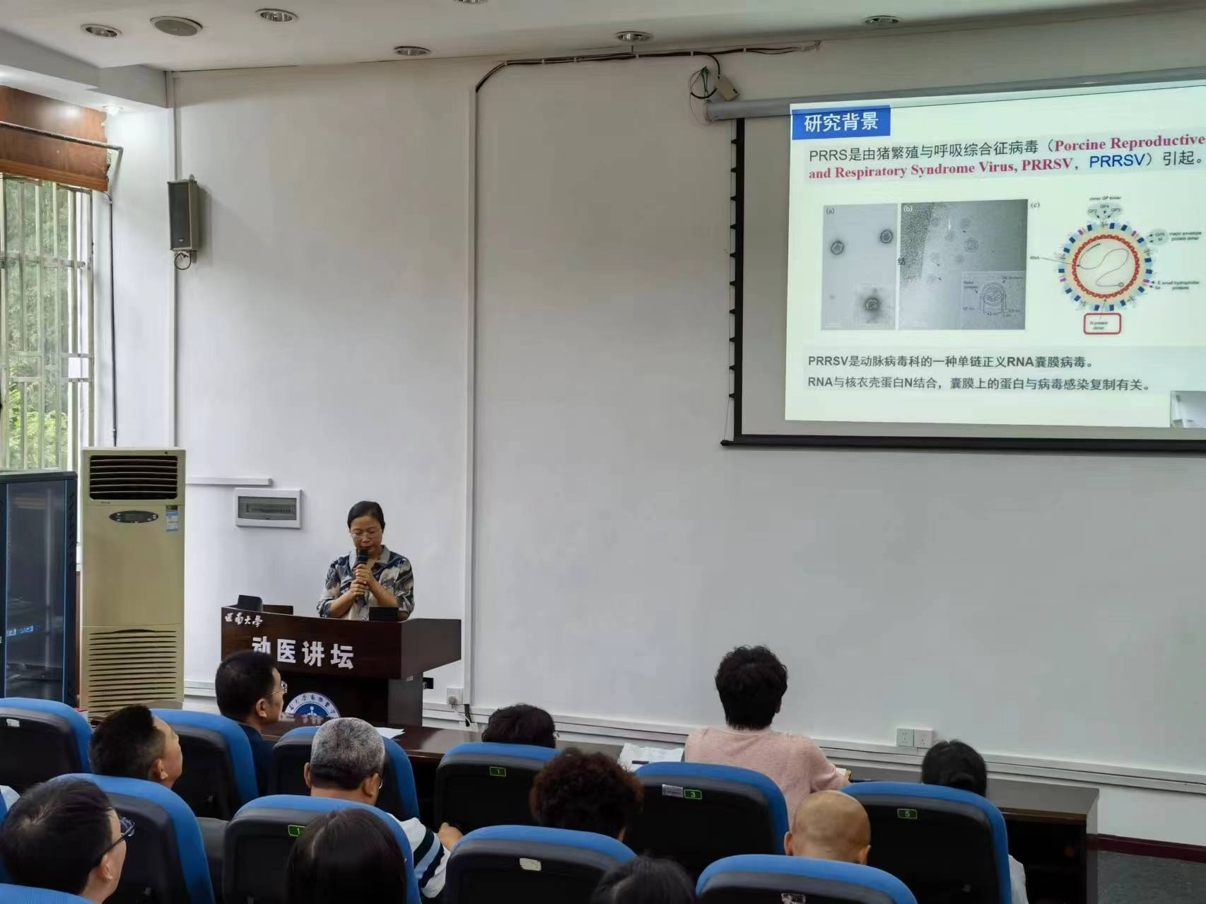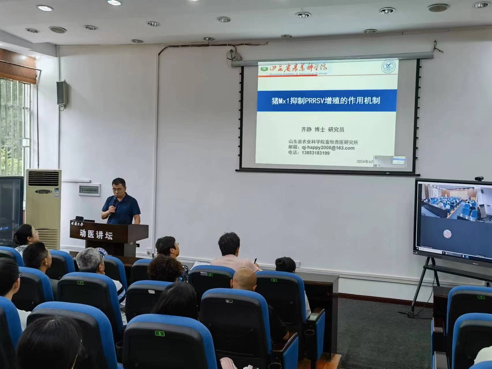 6月27日,山东省农业科学院畜牧兽医研究所齐静研究员在3110报告厅为学院师生做了一场题为“猪Mx1抑制PRRSV增殖的作用机制”的学术报告。报告由宋振辉副院长主持。齐静详细介绍猪先天性免疫蛋白Mx1的GTPase活性,及其通过与Nsp9蛋白竞争和抑制PRRSV-N与Nsp9互作,发挥抑制PRRSV的作用。齐静精彩的报告引起老师和同学们广泛兴趣,报告结束后并与老师和学生们进行互动,细致的回答和讨论了报告中研究问题。齐静的报告提升了师生对猪先天免疫在抗病毒感染作用的理解,拓展了开发抑制PRRSV药物的思路。