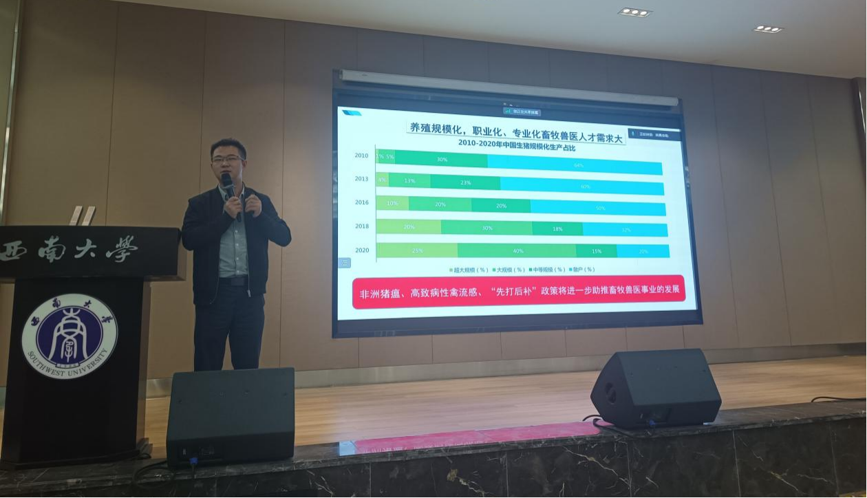 2009级校友欧云文以“青春在服务乡村振兴中闪光”为题,介绍其学习工作经历、科研之路、创新创业大赛、技能大赛与兽医临床技术服务等宝贵经验,极大地激发了同学们的热情,坚定了同学们继续深造兽医专业的决心。