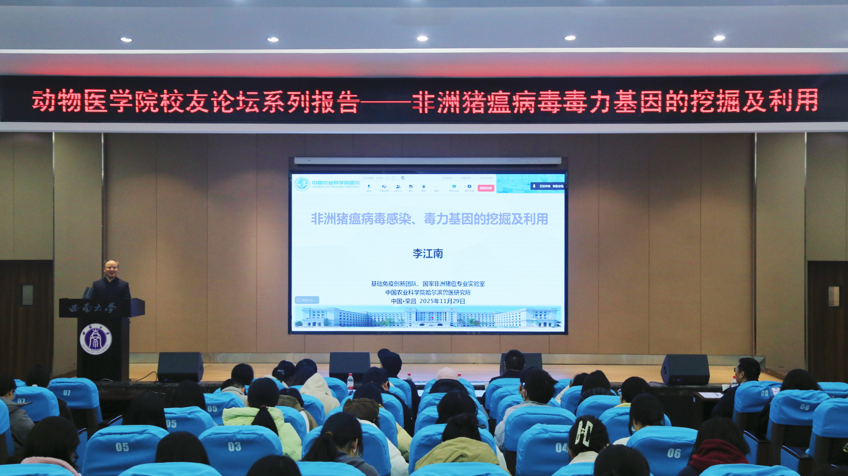 在荣昌校区2211报告厅成功举办校友论坛系列报告。本次活动邀请学院2005级动物医学专业校友、中国农业科学院哈尔滨兽医研究所李江南副研究员担任主讲嘉宾,带来题为“非洲猪瘟病毒毒力基因的挖掘及利用”的专题报告。学院300余名师生线上线下积极参会,会议由陈红伟教授主持。
